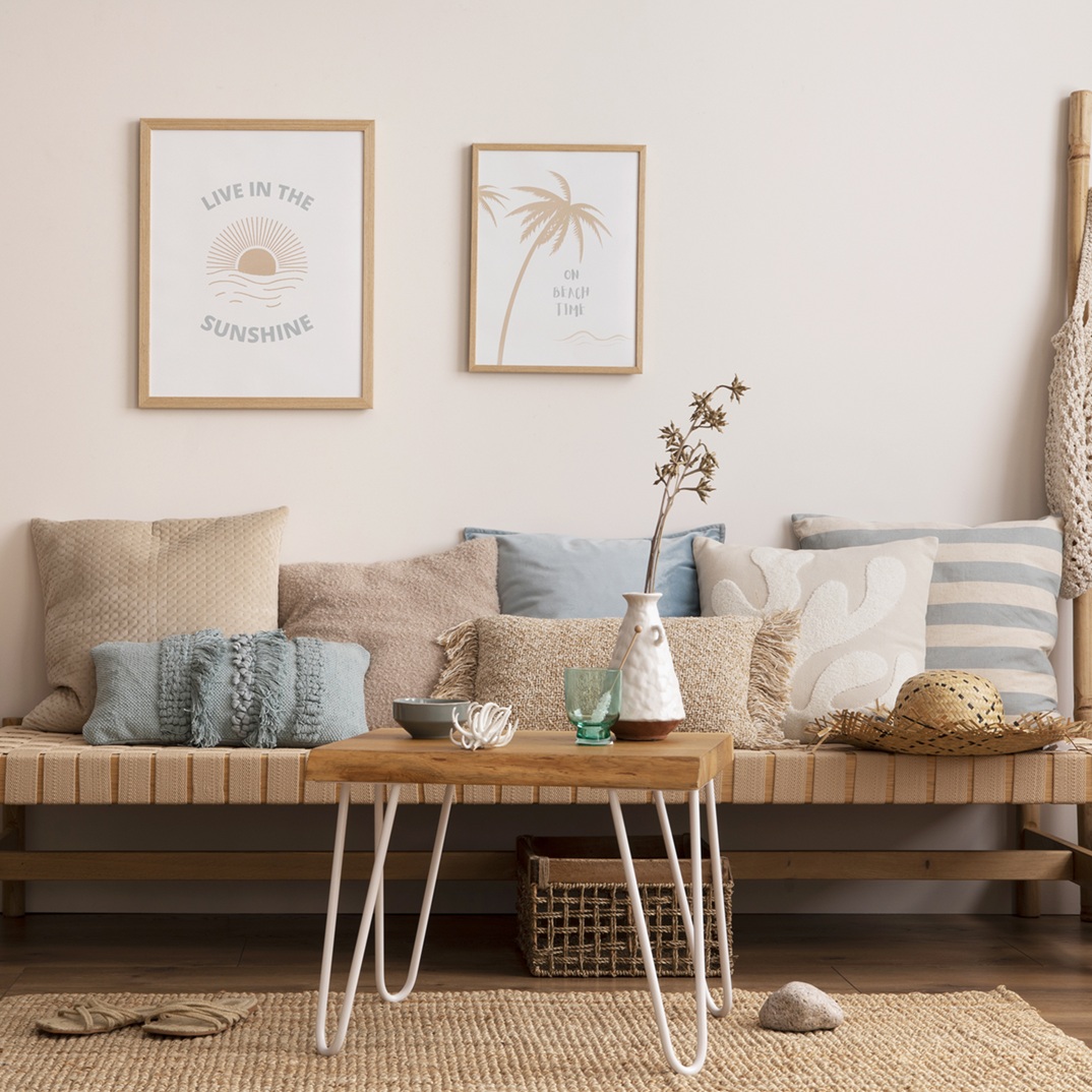 Stick with soft, sun-washed tones like white, beige, sandy taupe, or light blue. These shades instantly evoke the feeling of sea and sky, and give your living room that breezy, peaceful energy we all love in coastal spaces.